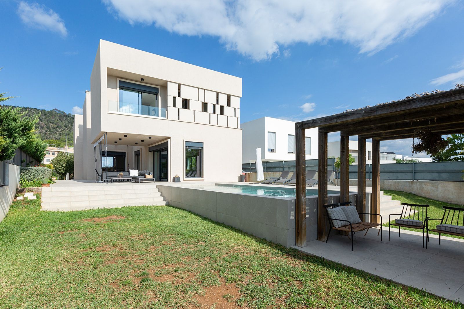 Zeitgenössische Eleganz trifft auf Familienkomfort In der begehrten Wohngegend von Son Puig gelegen, neben den Gebieten Son Vida und Son Rapinya, vereint diese atemberaubende Villa moderne Architektur mit zeitloser Raffinesse — der perfekte Rückzugsort für Familien, die Raum, Stil und Ruhe nur wenige Momente von Palma entfernt suchen. Im Inneren erkennt man den detaillierten Ansatz eines talentierten Architekten, der es geschafft hat, ein Gefühl von Licht aus allen Richtungen zu schaffen – das Haus ist voller Luft und Eleganz und bleibt dennoch perfekt für ein Familienleben geeignet. Das Haus befindet sich auf einem flachen Grundstück in einer von üppigem Grün und Golfplätzen umgebenen Straße, mit der renommierten Green Valley Privatschule nur einen kurzen Spaziergang entfernt. Für einfaches Wohnen und Unterhalten konzipiert, bietet der Außenbereich einen funkelnden privaten Pool und einen schattigen Ess- und Grillpavillon, der zu entspannten Nachmittagen und unvergesslichen Zusammenkünften unter der mallorquinischen Sonne einlädt. Auf ca. 630 m² bebauter Fläche bietet diese Villa 7 geräumige Doppelzimmer und 6 Badezimmer, verteilt auf drei Ebenen und durch einen Aufzug für vollständigen Komfort verbunden. Im Erdgeschoss fließt das offene Layout nahtlos zwischen der Designer-Küche, dem Essbereich und dem lichtdurchfluteten Wohnbereich – alle öffnen sich zu den Garten- und Poolterrassen. Zwei Gästezimmer und ein gemeinsames Badezimmer vervollständigen diese Ebene. Die obere Etage beherbergt die beeindruckende Master-Suite mit begehbarem Kleiderschrank und einem luxuriösen Badezimmer (von diesem Raum aus können Sie den Blick in die Ferne über Palma und sogar teilweise Meerblick genießen), sowie drei weitere Doppelzimmer, jedes mit eigenem Bad, und einen weiteren flexiblen Raum, ideal als Heimkino, Spielzimmer oder privater Lounge. Das Untergeschoss bietet eine Doppelgarage, einen geräumigen Waschbereich, Abstellmöglichkeiten und eine Gäste- oder Personal-Suite mit eigenem Bad. Durchdacht ausgestattet mit Fußbodenheizung, zentraler Klimaanlage, einem Photovoltaiksystem und einem privaten Aufzug, bietet die Villa jeden modernen Komfort mit makellosem Stil. Das Leben in Son Puig bietet das Beste aus beiden Welten: eine ruhige, familienorientierte Gemeinschaft am Rande von Palma, aber nur eine kurze Fahrt vom pulsierenden Herzen der Stadt und dem Yachthafen entfernt. Tägliche Annehmlichkeiten, Sportvereine, Krankenhäuser und Einkaufszentren sind leicht erreichbar, ebenso wie erstklassige internationale und spanische Schulen. Mit hervorragendem Autobahnzugang sind die Strände der Insel und charmante Bergdörfer nur wenige Minuten entfernt. Diese außergewöhnliche Immobilie vereint raffiniertes Design, Familienfunktionalität und eine unschlagbare Lage — ein wahres Refugium des Komforts und der Klasse in einem der begehrtesten Viertel Palmas. Haftungsausschluss – Die Informationen zu dieser Immobilie dienen ausschließlich allgemeinen Informationszwecken. Obwohl wir uns um Genauigkeit bemühen, werden einige Details von Dritten bereitgestellt. Wir übernehmen keine Garantie für die Richtigkeit oder Vollständigkeit dieser Informationen und haften nicht für etwaige Fehler. Wir empfehlen allen interessierten Parteien, sich unabhängig rechtlich beraten zu lassen und ihre eigenen Überprüfungen durchzuführen.